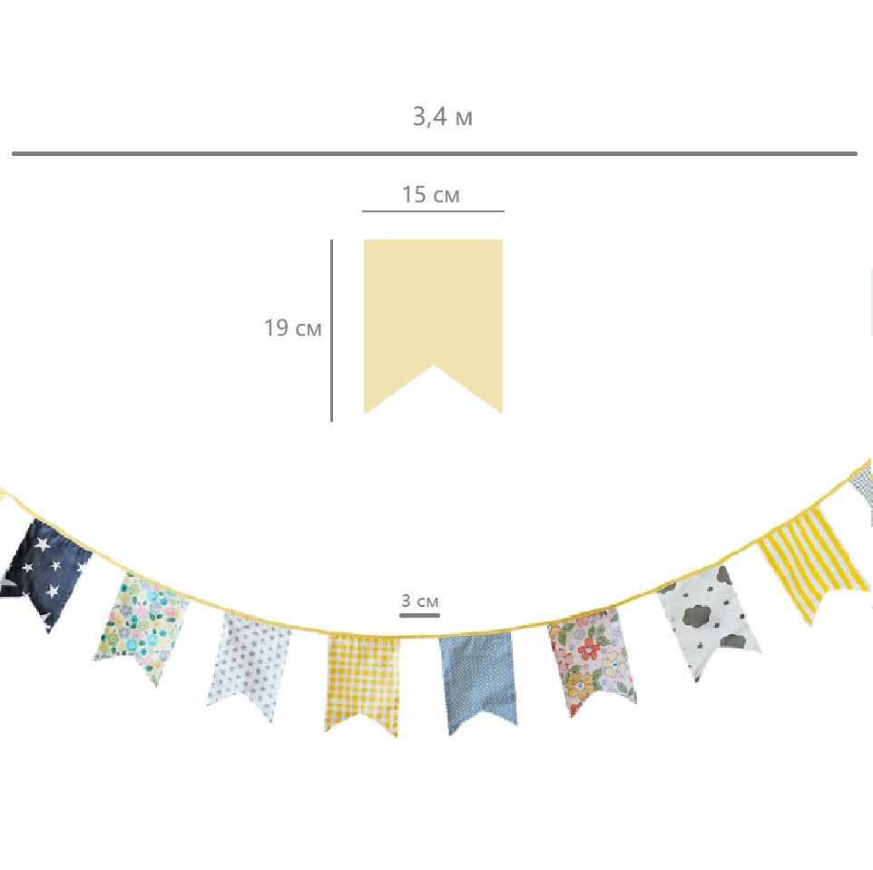 Гирлянда состоит из 12 флажков, общая длина составляет 3,4 м, расстояние между флажками 3 см, длина матерчатых флажков 2,1 м, длина лямок с обеих сторон по 50 см