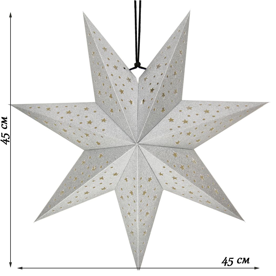Семиконечная объемная звезда 45 см — великолепный декор из тонкого перфорированного картона с серебристыми блестками. Создает красивые световые эффекты. Поставляется в сложенном виде, в комплекте шнур для фиксации объема и подвеса.